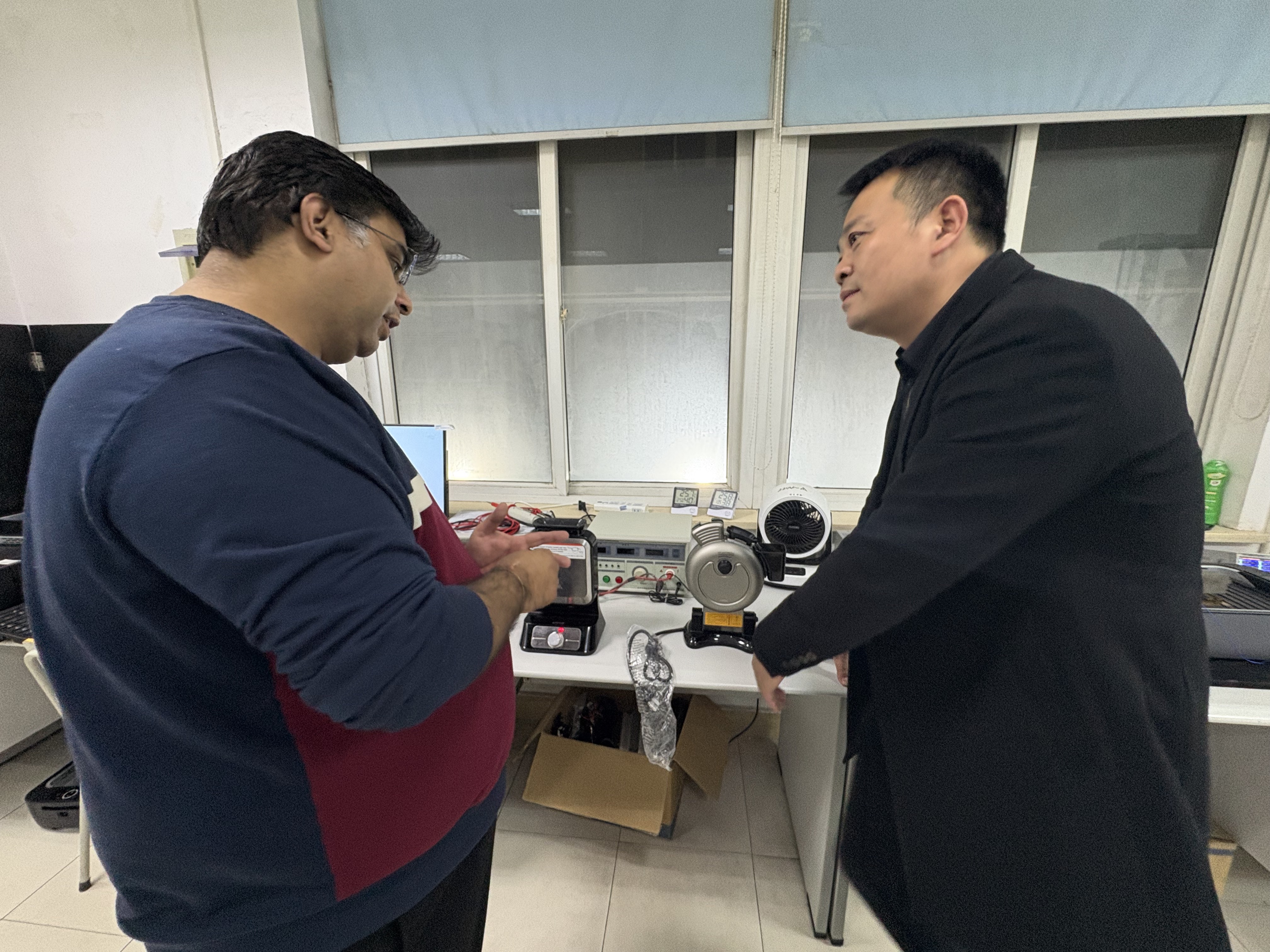 Accompanied by the company's technical team, the client delegation first visited the company's core laboratory and testing center, observing the entire product performance testing process. Technical engineers provided detailed demonstrations of the independently developed smokeless barbecue grill and waffle maker, comprehensively showcasing the company's technical strength and quality control capabilities in electrical appliances, from core parameters to actual test data. The clients highly praised the professional configuration of the laboratory, the rigorous testing process, and the stable performance of the products. Both sides conducted detailed technical discussions and confirmed details regarding product prototypes.