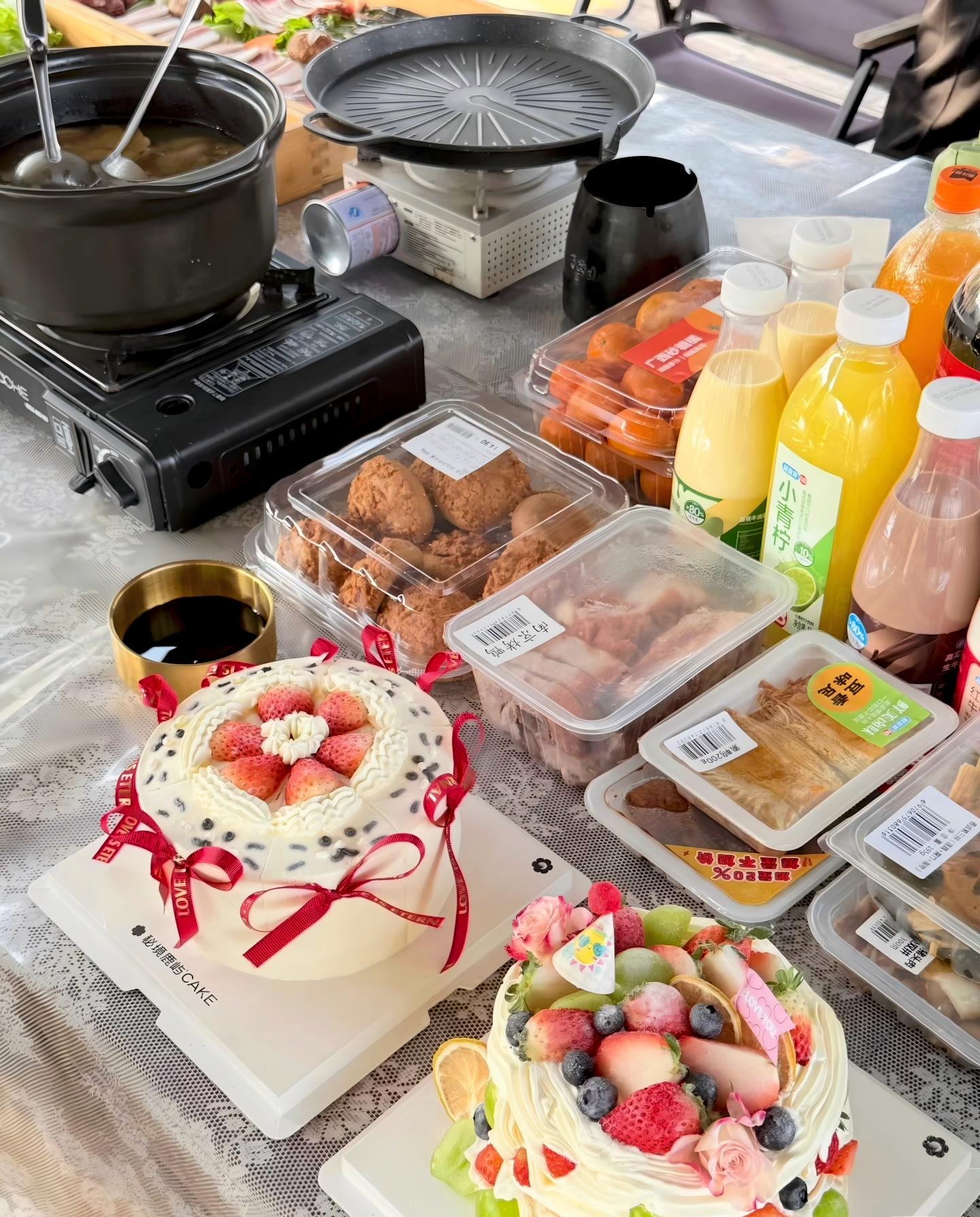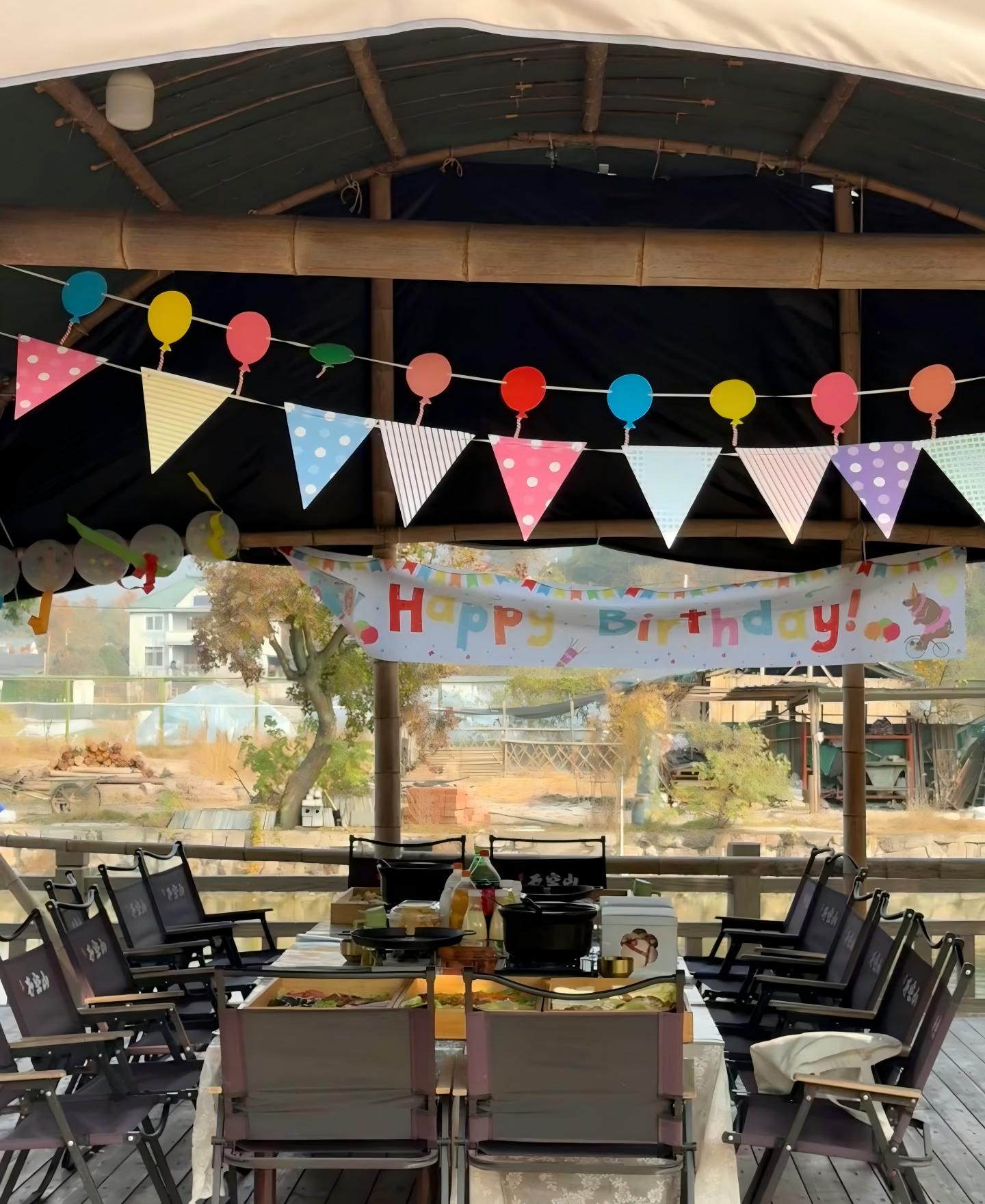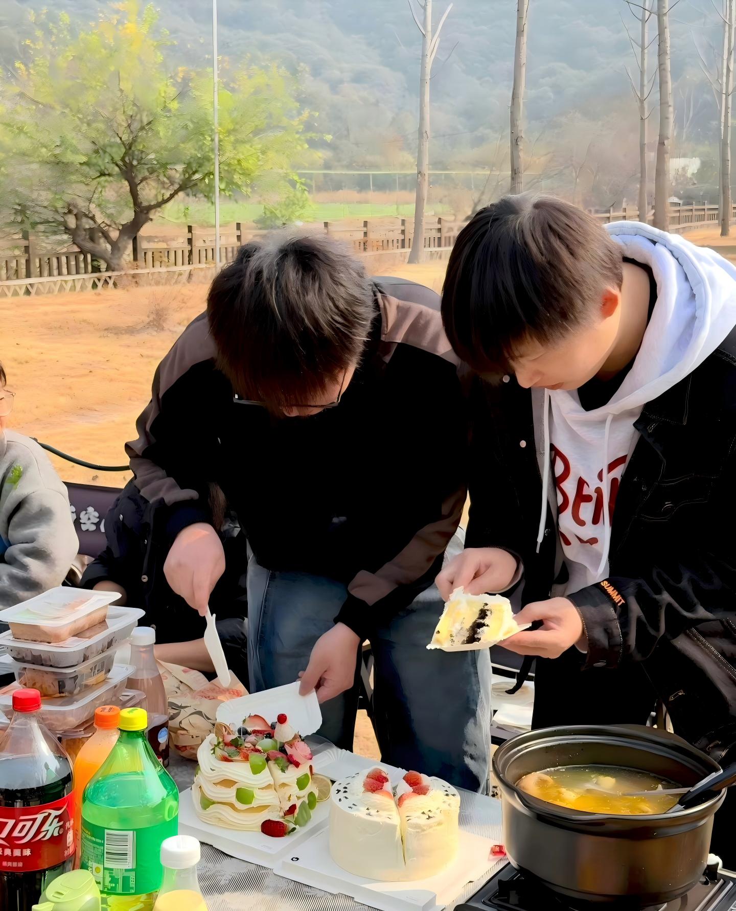 The team building activity was held at a scenic outdoor campsite. The venue was warmly and energetically decorated. The event kicked off with a sumptuous outdoor barbecue and party, featuring exquisite double-layered fruit cakes, steaming hot pot, and various drinks and snacks, allowing everyone to relax and chat freely while enjoying delicious food.